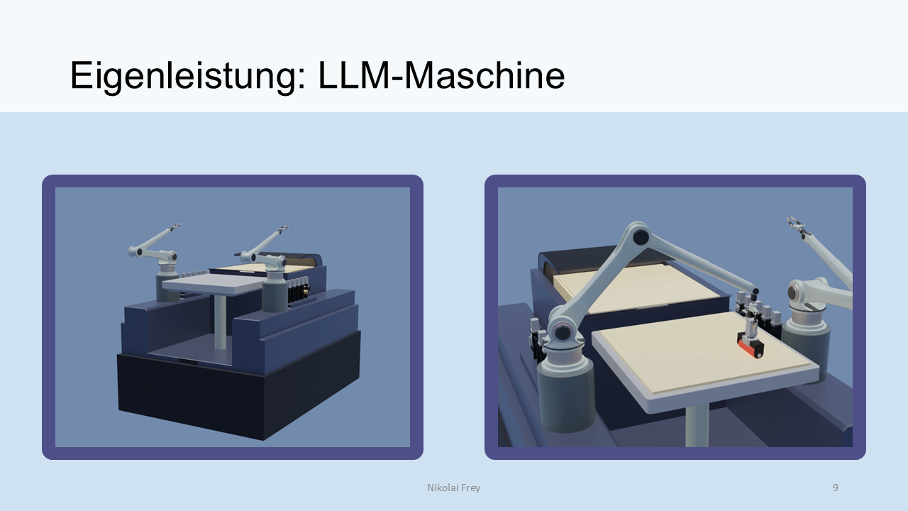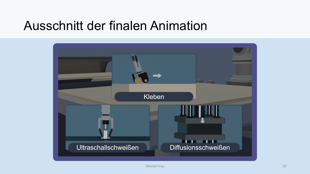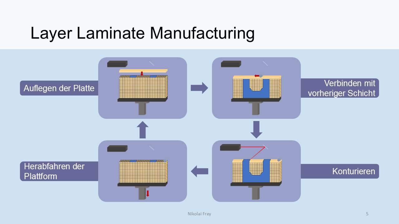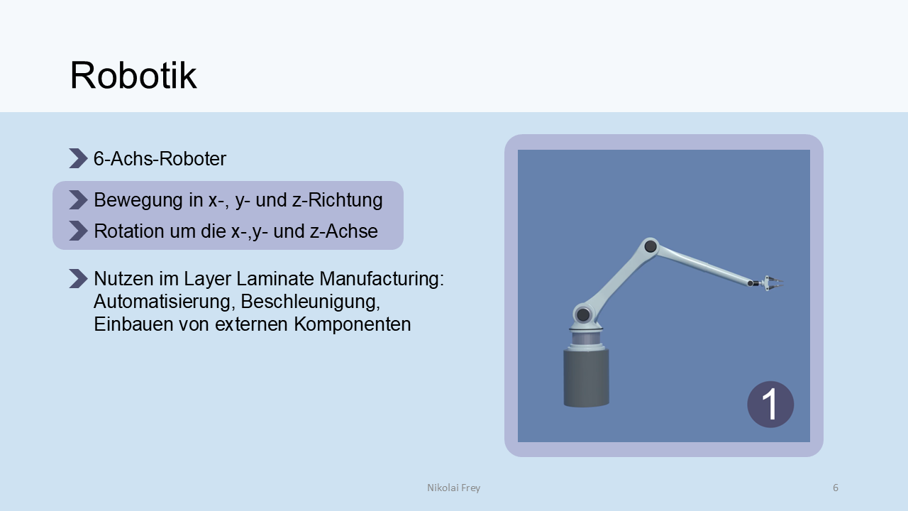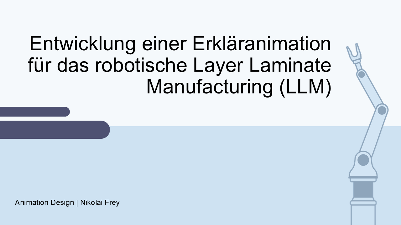 Diese PowerPoint-Präsentation wurde nebenbei zu dem Erklärvideo von dem robotischen Layer Laminate Manufacturing erstellt und soll Teile des Gedanken- und Arbeitsprozess zusammenfassen. Neben dem Layout wurden auch alle weiteren Grafiken selbst erstellt, der Fokus dabei war, dass auf so viel Text wie möglich verzichtet werden sollte und durch Bilder und Erzählung der Inhalt verstehen werden soll.